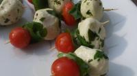Caprese salad in bite-size portions! Skewers of mozzarella, basil, and tomatoes.