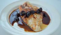- 1 Mix chicken broth, balsamic vinegar, and cranberries; pour into the hot skillet or small sauce pan. Simmer until reduced by half, a couple of minutes.
